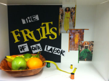 As an LIM College student you will have the opportunity to get your creative juices flowing. In my Intro to Visual Merchandising class, we are asked to present a specific theme in a shadow box that displays the topic of emphasis. Last week we focused on fresh fruit. In the spirit of Fashion Week I derived inspiration from the bright colors saturating the runways, and utilized the saying “The Fruits of Our Labor.” I paid tribute to the designers that pour their heart and soul into creating the perfect “fruit” that they will “labor” over for a great amount of time.